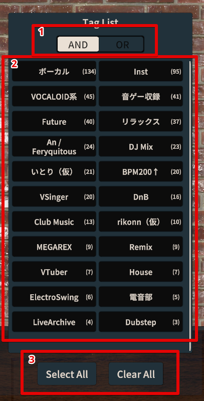 AND filters for “videos that contain all selected tags”, OR filters for “videos that contain at least one of the selected tags”. - You can select tags to filter videos.