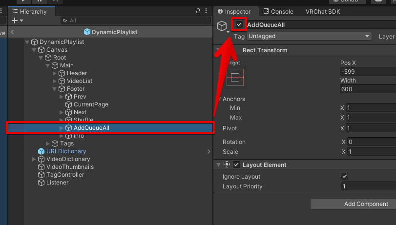 - In Unity, open the prefab “DynamicThumbnailPlaylist_Base”, select “AddQueueAll” located as shown in the image, and turn it ON.