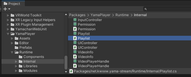 In Unity, select the “Playlist” file in the Packages/YamaPlayer/Runtime/Internal folder. (The one with the # icon)