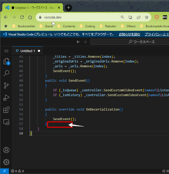 Copy the following string and paste it to the right of the 3rd “}” from the bottom (red frame area) in VSCode Online that you opened earlier.